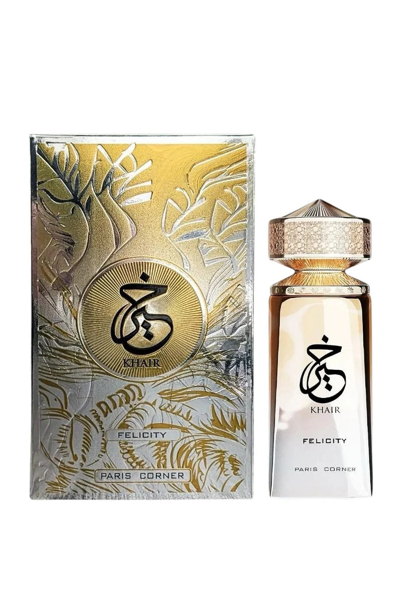 Khair Felicity de Paris Corner es una fragancia unisex que ofrece una experiencia olfativa dulce y floral. Con una apertura de grosella negra, champán y fresia, seguida de un corazón floral de rosa de mayo, jazmín y almizcle, y un fondo cálido de vainilla, azúcar y almizcle, esta fragancia es ideal para quienes buscan un aroma distintivo y envolvente.
